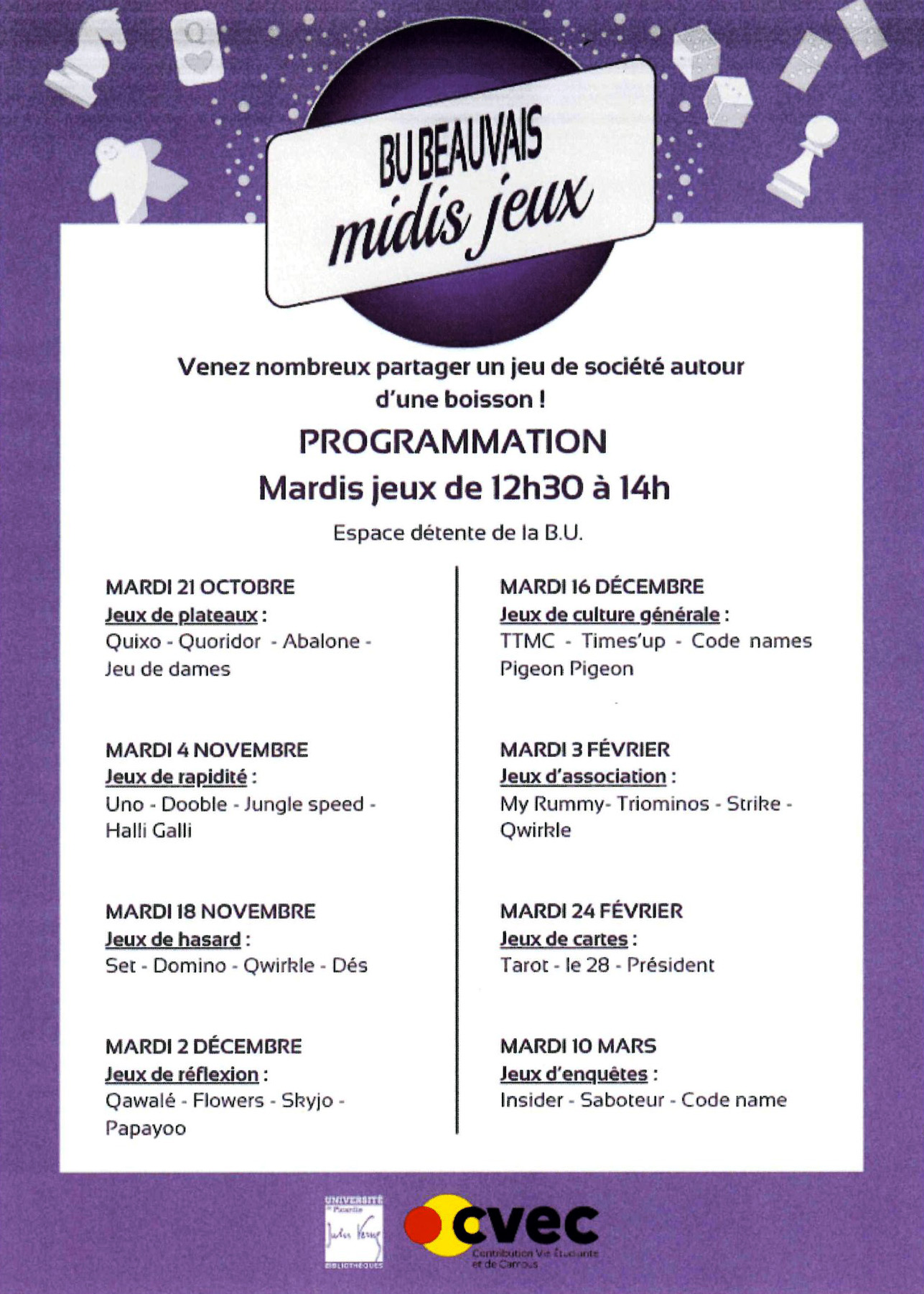 La bibliothèque de Beauvais reprend sa programmation des midis-jeux. Voici les dates et la liste des jeux qui vous seront proposés de 12h30 à 14h, dans l’espace détente de la BU.